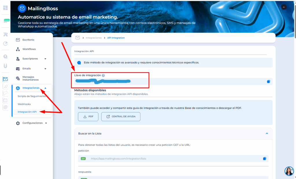 El token necesario para autenticar las solicitudes a la API se encuentra en la sección “Clave de Integración” de MailingBoss 5.0.